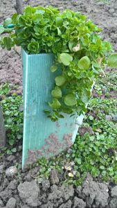 Felülről kell az oltványokra húzni, miután összehajtogattuk az eredetileg kiterítetten szállított hengereket. Az aljuk földdel jól takarható, s így rögzíthető. (Néha persze előfordul, hogy valaki fordítva helyezi fel, ahogy alább is látszik.)
